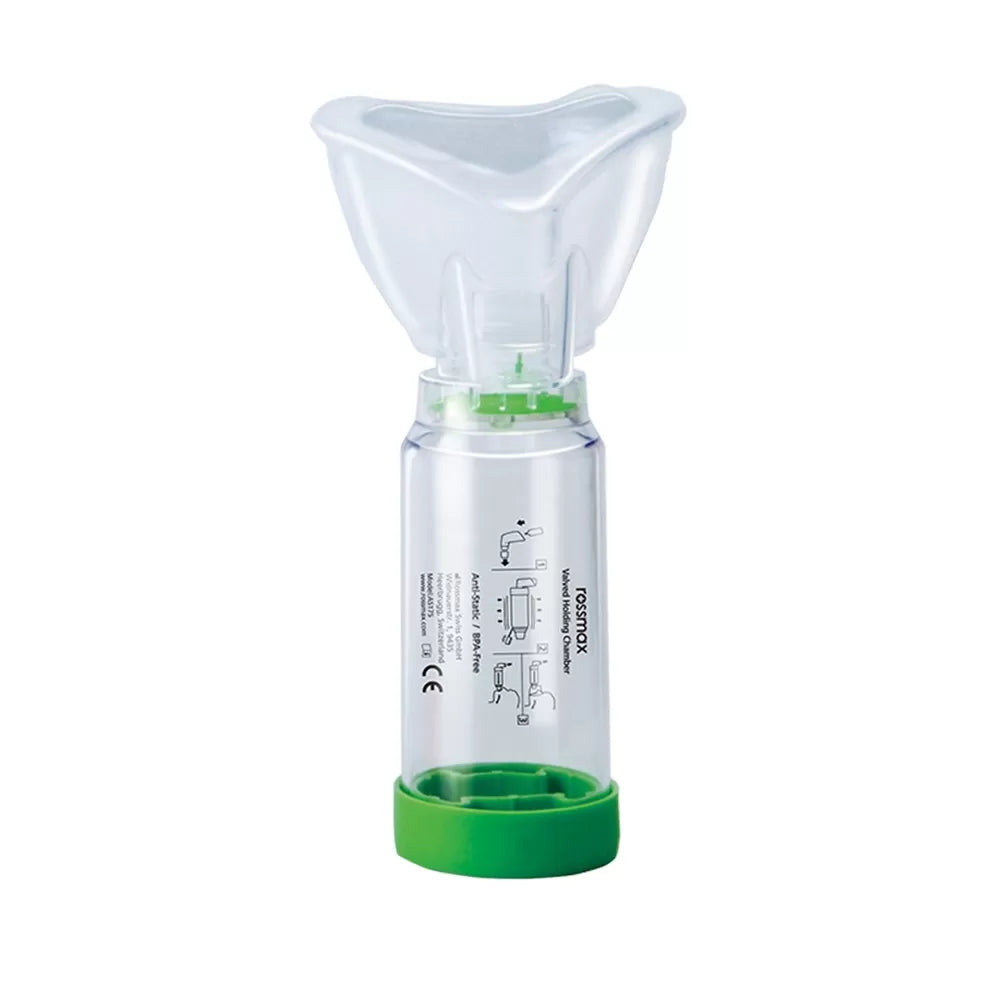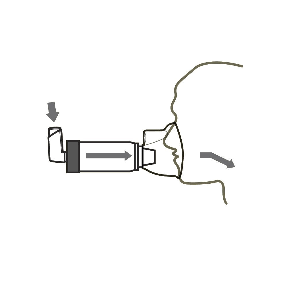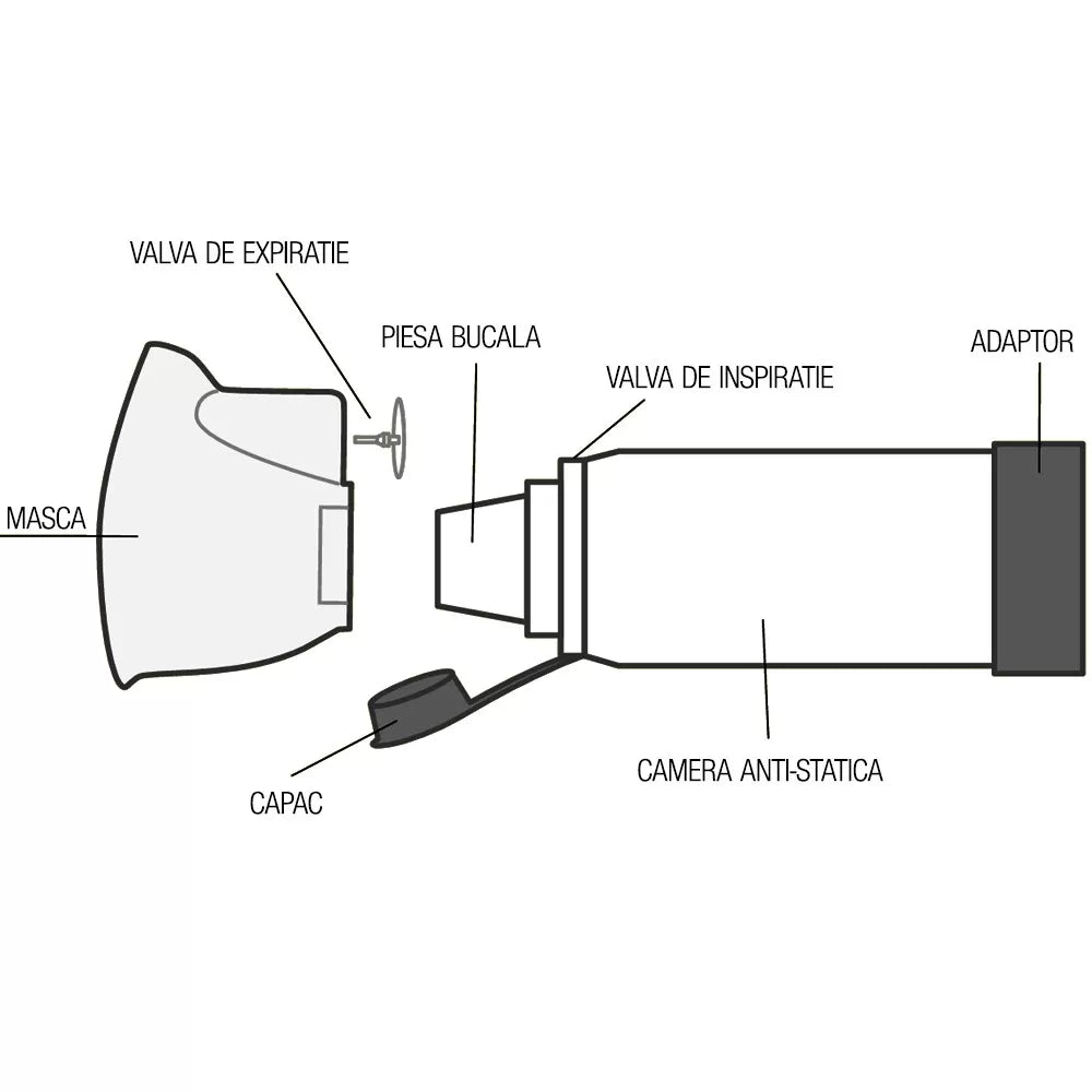 Camera de inhalare antistatica (175 ml) ce imbunatateste livrarea medicatiei si reduce pierderile prin reducerea depunerilor de medicament pe peretii camerei;
