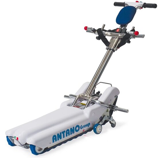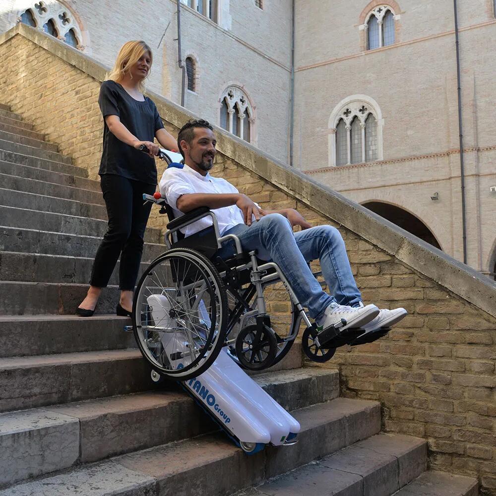 Elevator electric pentru urcat - coborat scari - dispozitiv medical destinat persoanelor cu dizabilitati locomotorii pentru a urca/cobori la etajul unei cladiri ce nu este dotata cu lift. Pacientul sta pe fotoliul rulant care este asigurat pe corpul elevatorului, acesta fiind manevrat foarte usor de catre o alta persoana.