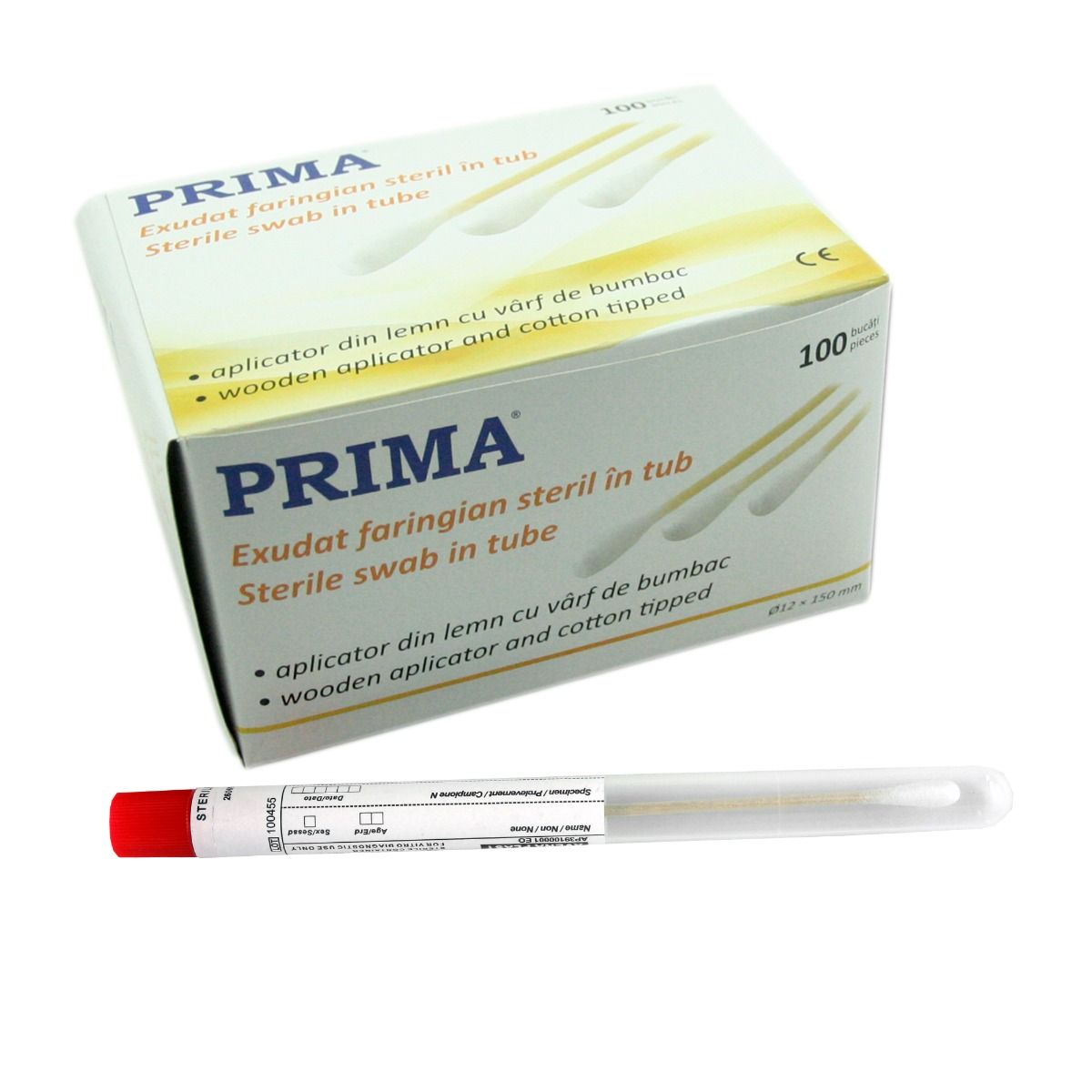Exsudat faringian steril PRIMA, in tub lemn/bumbac, 100 bucati