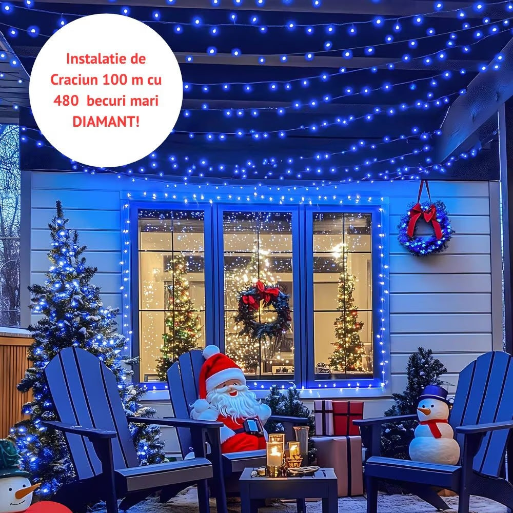 Instalatie De Craciun, Lungime 100 m, 480 LED-uri, Interior/Exterior, 8 Moduri De Lumini, Alimentare Priza 220V, Bec Diamant