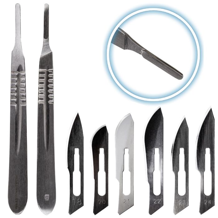 • Compatibilitate – lamele marimilor 10-17 sunt compatibile cu manerul de bisturiu nr. 3, iar cele de marimile 18-24 sunt compatibile cu manerul nr. 4