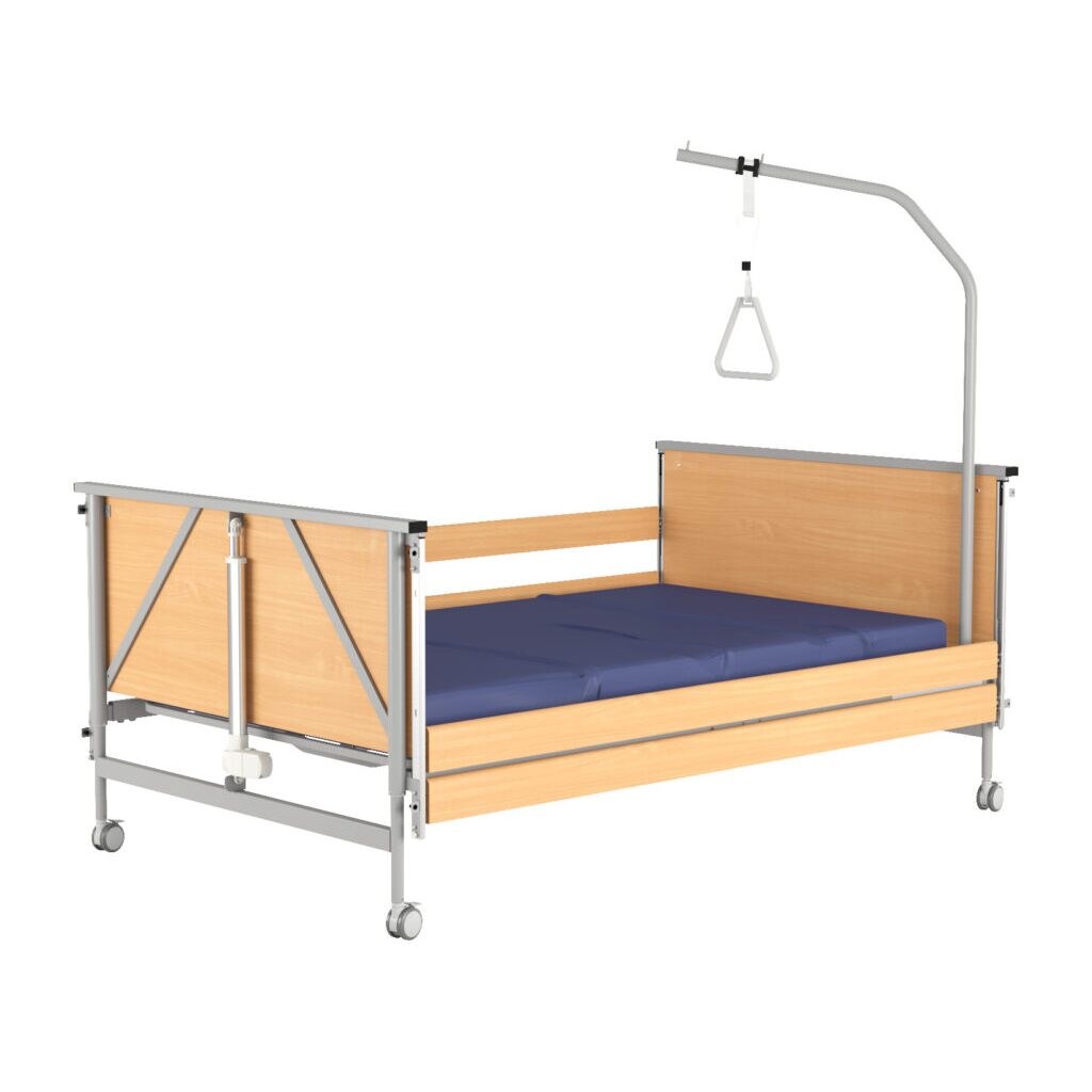 Descriere produs: Pat electric pentru ingrijire pacienti, cu 4 motoare, reglabil pe inaltime si pe sectiuni, suport cu maner de sprijin, Taurus 2 WIDE