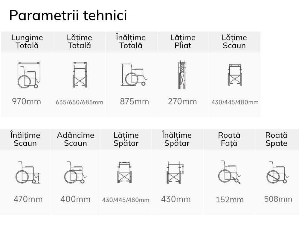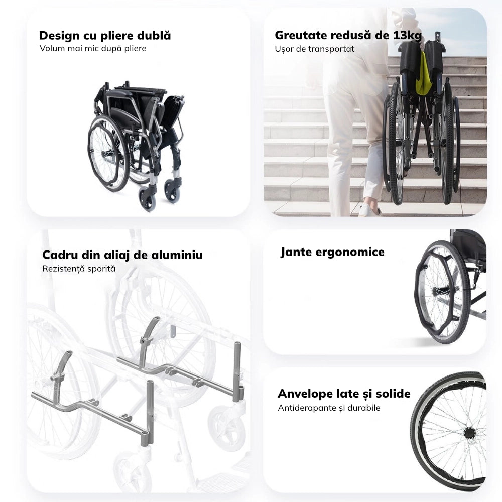 Scaunul rulant H053C este o optiune usoara si practica, realizata din aluminiu si conceputa pentru utilizatorii care au nevoie de mobilitate sporita.